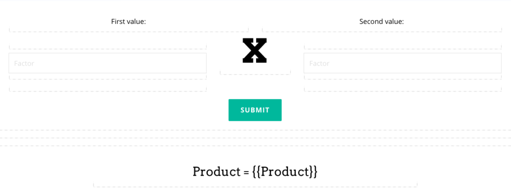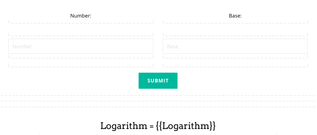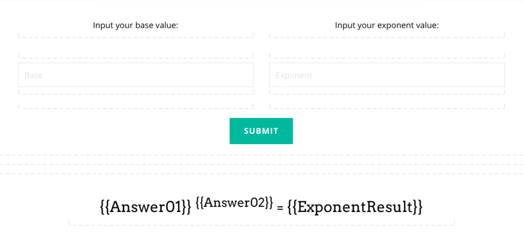 On the page, the dynamic text content (“{{Answer01}}{{Answer02}}={{ExponentResult}}”) is replaced with the user submitted values and the calculated ExponentResult.