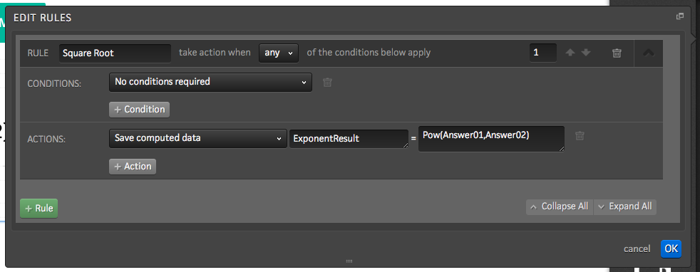 The square root formula “sqrt( )” returns the square root of the value in the parenthesis. If a user were to submit a value into a data field, a rule could be configured to find “sqrt(UserValue)” and save the value into a new data field (in this example, “SquareRoot”). In the example below, the user input is saved as “Answer01”.