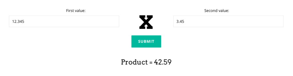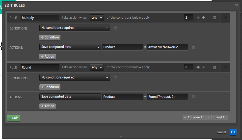 On submit, the page refreshes and runs two rules. The first simply multiplies the two factor variables by one another and saves them into the new data field “Product”. The second uses the Round formula to round the Product result by 2 decimals and updates the Product data field with the new rounded value.