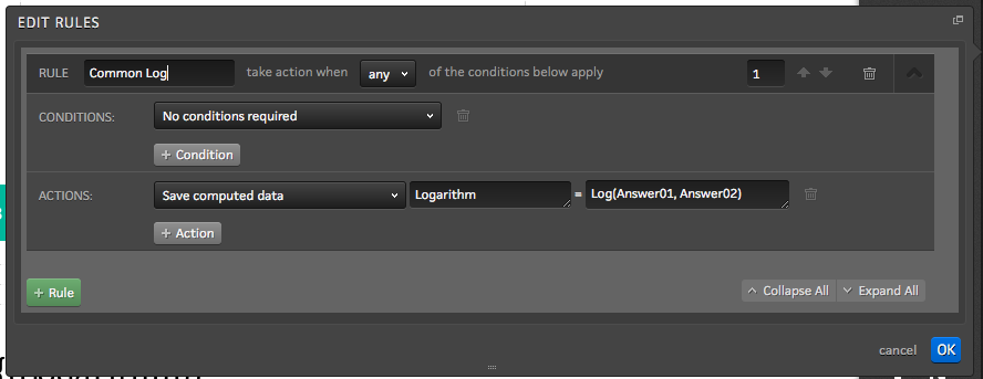 This rule computes the Log of Answer01 with a base of e. It then saves that value into a new data field called “NaturalLog”.