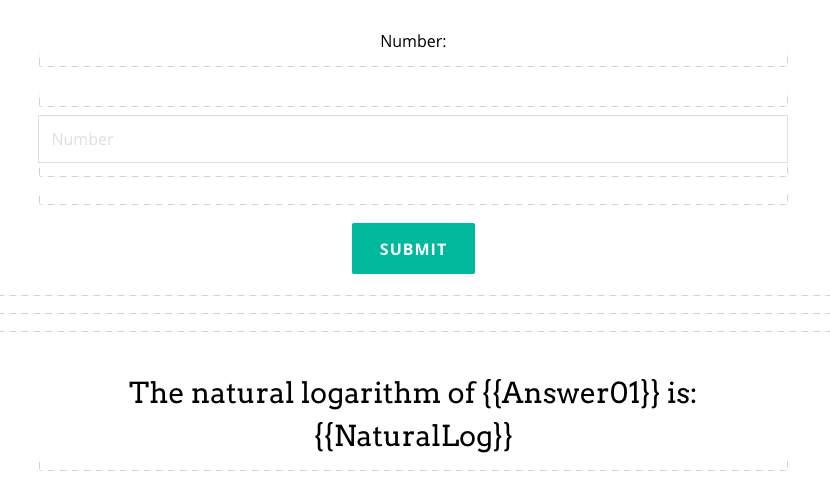 In the example above, the user is able to input two values, the first for the number and the second as the base, which save to data fields “Answer01” and “Answer02”.