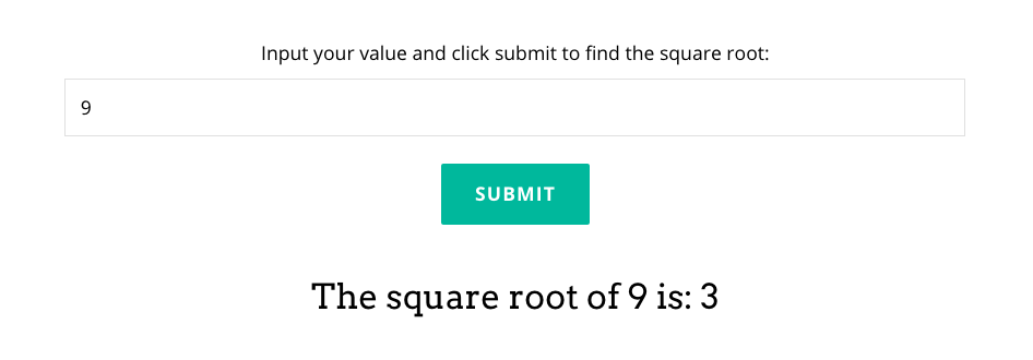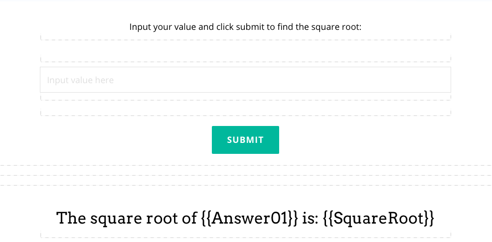 Once the run has run, the dynamic content variables on the page (originally “The square root of {{Answer01}} is: {{SquareRoot}}”) are updated to display both the user’s input and the computed value.