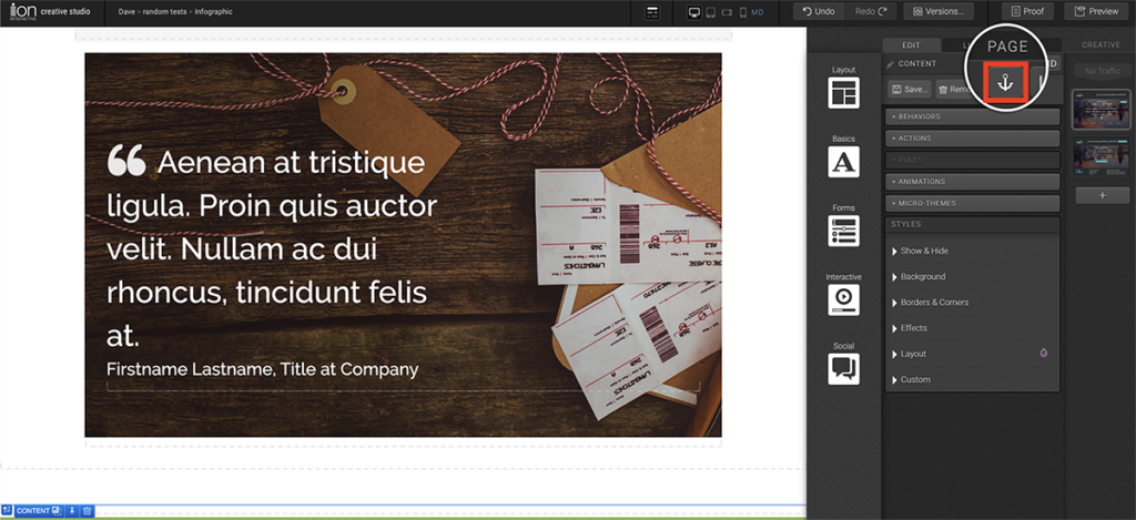 This can be done by selecting the container/element you want to anchor down to, and then click the anchor icon in the top right corner of your creative studio.