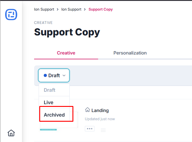 To archive a creative, you will first want to navigate into the Creative Management screen for that experience. From here, click the Status dropdown menu and select “Archived.”
