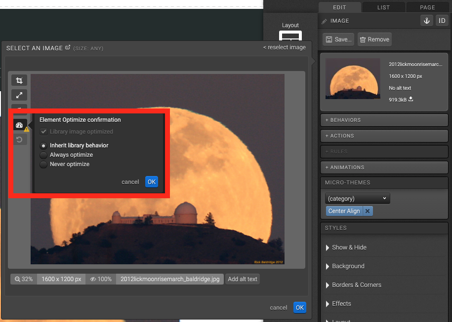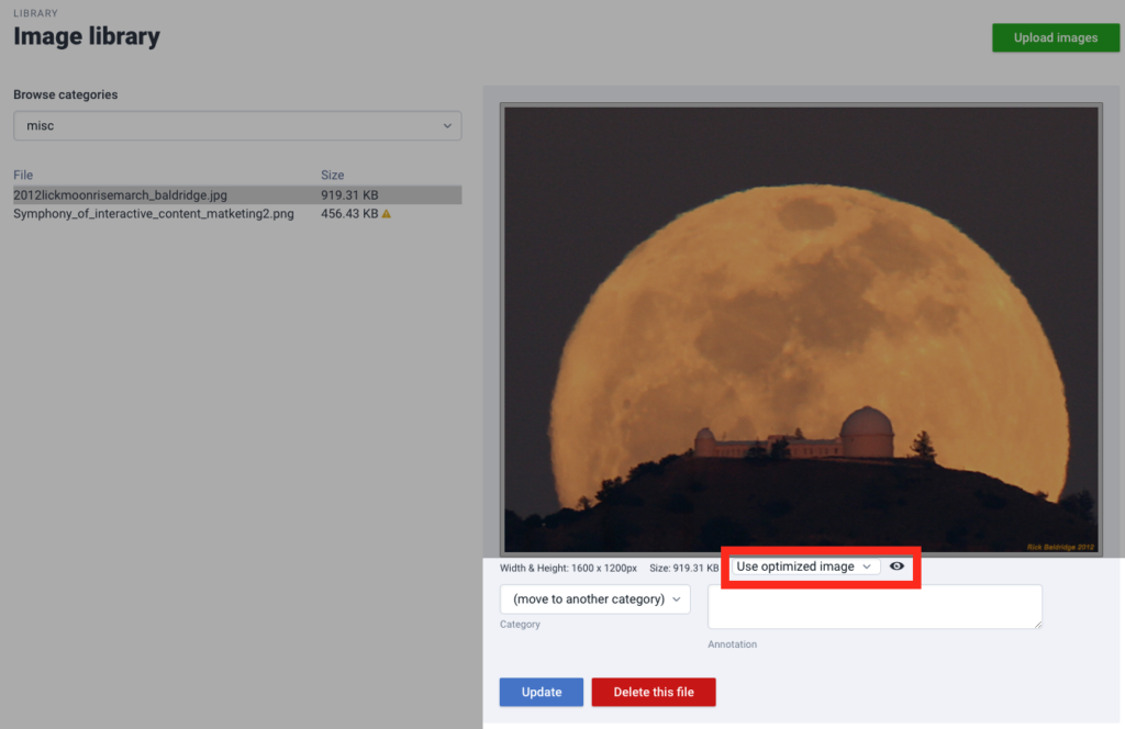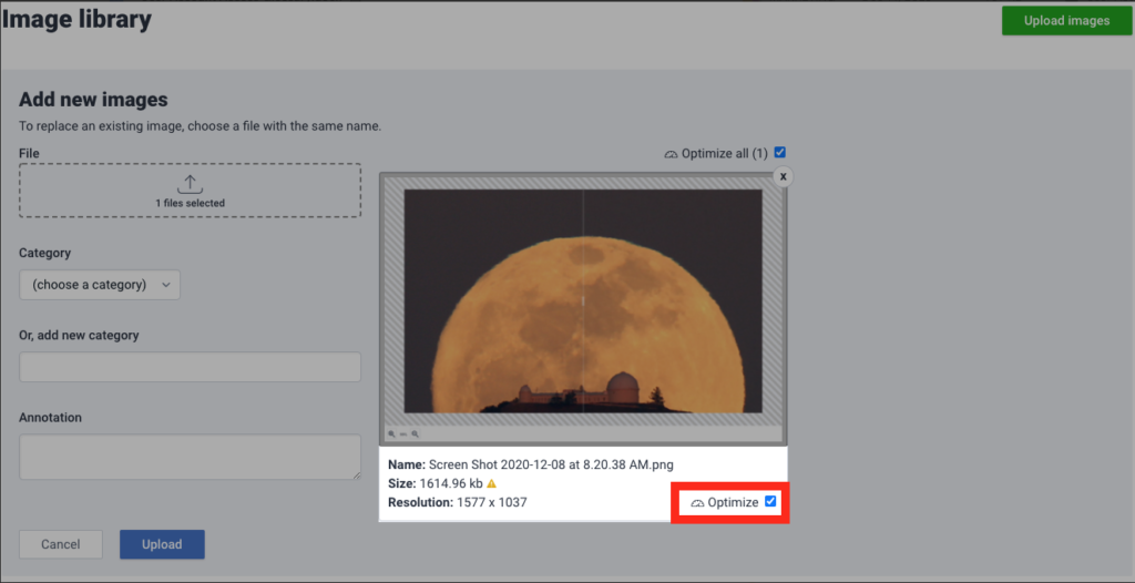 When uploading images to your image library, you can check the Optimize checkbox and we’ll create a compressed version of your image you can use instead of the original image to help speed up your page speed. This is particularly helpful for larger images that are over 300 kb in size.