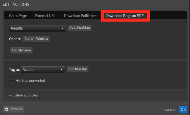 When setting the action for your button, click the Download Page as PDF tab and select the page you would like to download from that button.