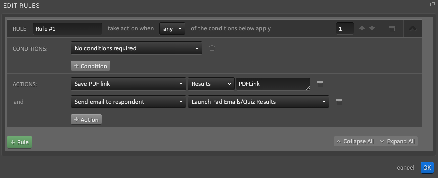 For example purposes, let’s say you have a short form on your Results page for respondents to have their results emailed to them. In this scenario, you would add the “Save PDF link” rule to the submit button along with a rule to send your email template to the respondent.