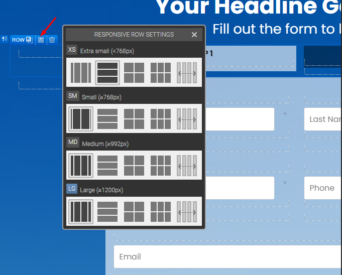 – You can manually rearrange elements in SM and XS using Row settings to look the same as LG.