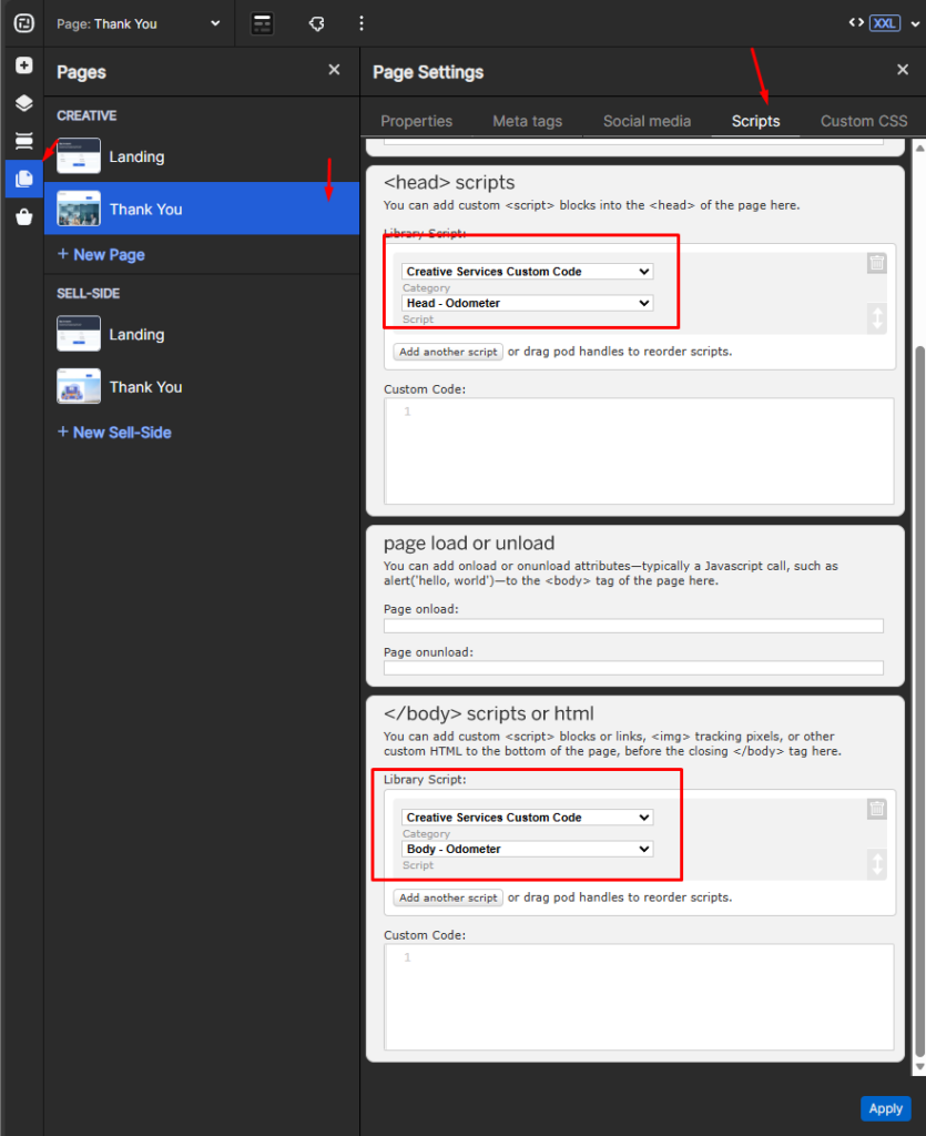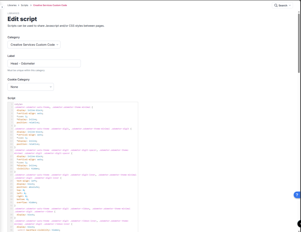 1. Add the “Head – Odometer” script found in the “Custom Scripts” category to the head of the creative. Add the “Body- Odometer” script found in the “Custom Scripts” category to the body of the creative.