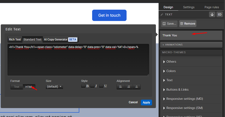 2. Select or add a text element on the page and edit it by selecting Standard Text making sure HTML is toggled on and then paste the following code: