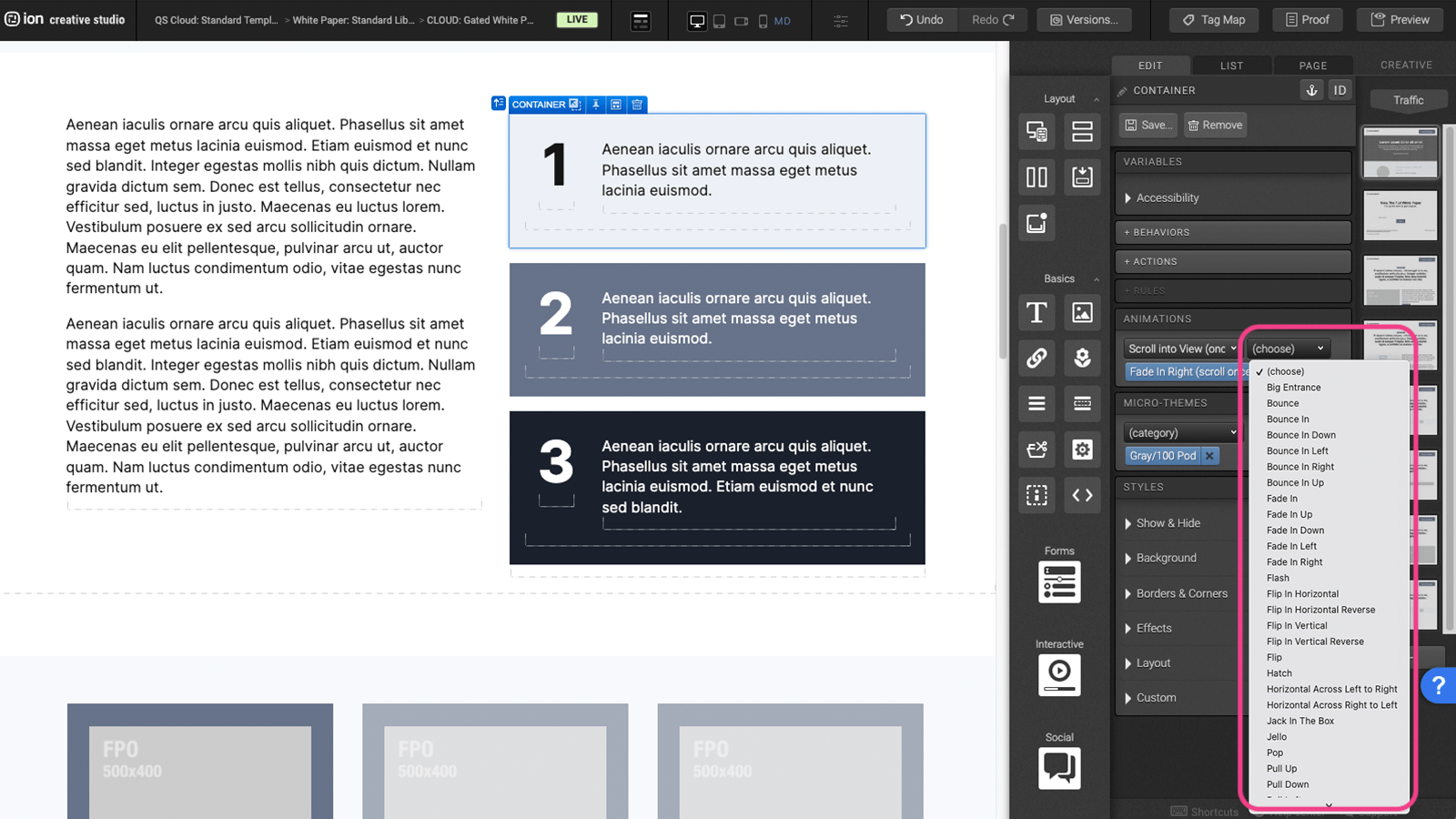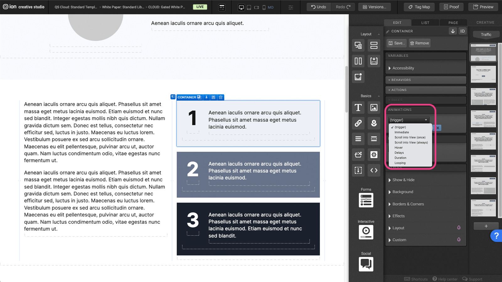 The Gated White Paper experience is designed to gain lead generation. The visitors are introduced to the white paper on the landing page and have the option to view the first chapter. Visitors can unlock the rest of the chapters by filling out a form. This provides your company the opportunity to gain new customer information that can be used for future marketing purposes. Each chapter includes different interactive elements, such as animations, quizzes, flows and tabs. A navigation bar is located at the bottom of each chapter where the visitor can view the previous or the next chapter.