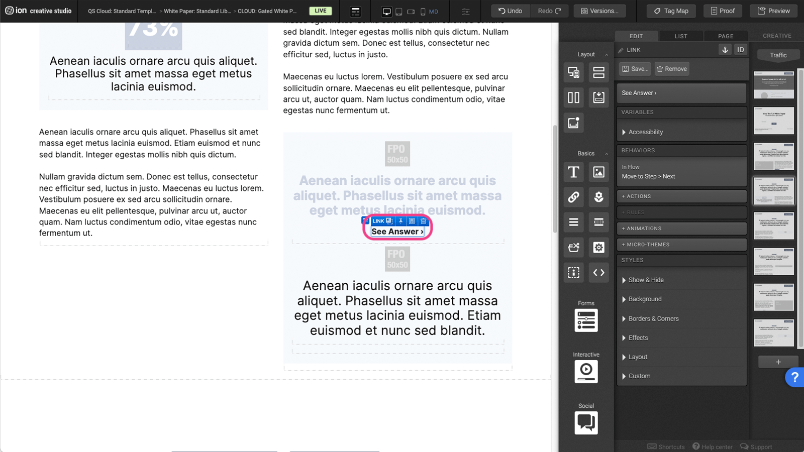 Step 3: The Link element works as a trigger to the next Flow Step. You can edit the behaviors of this element by first selecting it on the canvas.