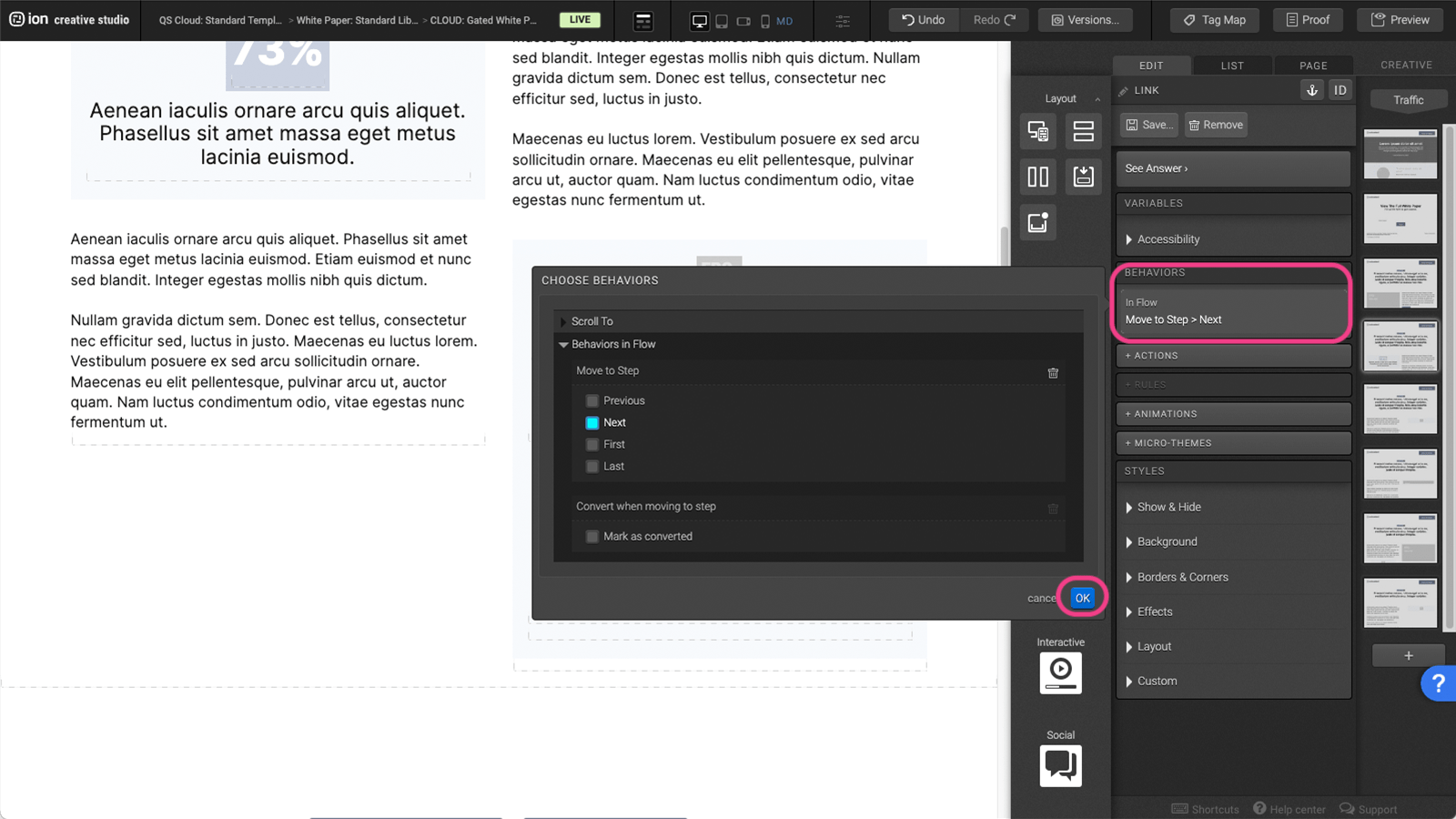 Step 4: Click into the Behaviors panel to open the settings. Here you can adjust the behaviors in the flow to Move to the Next step then press OK.