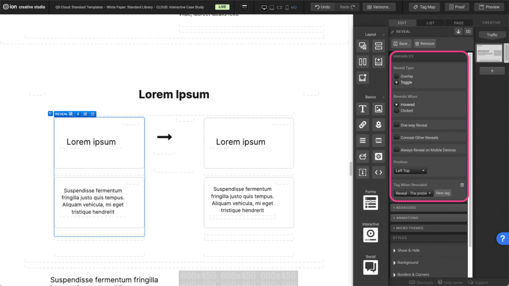 Step 2: Under the Variables panel, you can choose to change the Reveal type and when the reveal will appear by selecting from the options listed.