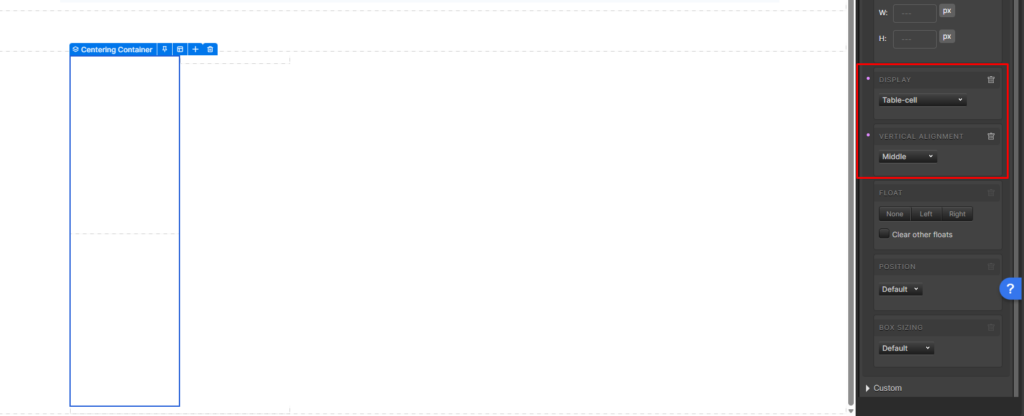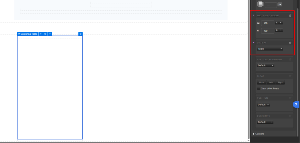 3. Add a container inside of the ‘Centering Table’ container, and change the name of the new container to Centering Container. Adjust the following layout settings for the new container: