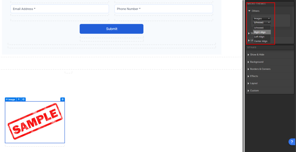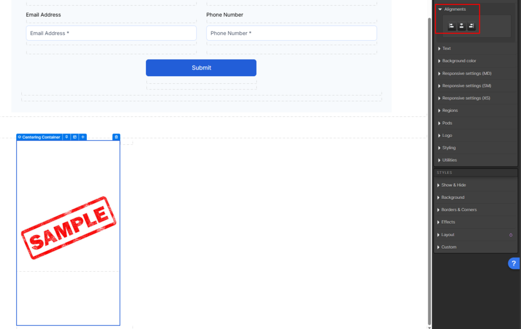 Custom CSS – Custom CSS can be applied at the page or creative level. A target or CSS class should applied. Text components use text-align, images and containers components use display. It is recommended to use the alignment micro-theme or text editor alignment, prior to using custom CSS.