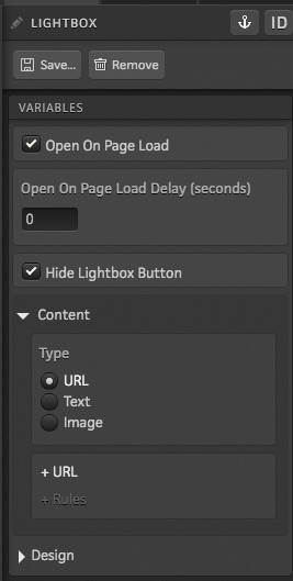 The “Hide Lightbox Button” option can be enabled to hide the contents of the Lightbox container when you view the page live. This can be helpful if you want to trigger a Lightbox to open on page load, but do not necessarily want to have a button on the page for respondents to click to open it.