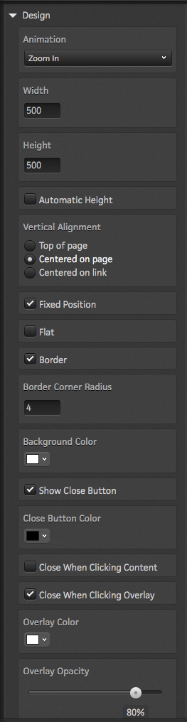 There are a ton of design options for the Lightbox window itself. After clicking into the Design tab for your Lightbox container, you will be able to set an animation for the Lightbox when it opens, specify the width and height, adjust the vertical alignment, border radius, the background color, overlay color and more.