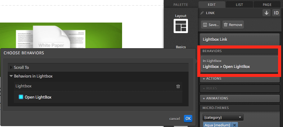 *Note: Anything published within the Lightbox container with this behavior assigned to it will disregard any actions that are assigned to that element and will instead reference the Lightbox container settings for what page to open within the Lightbox window.