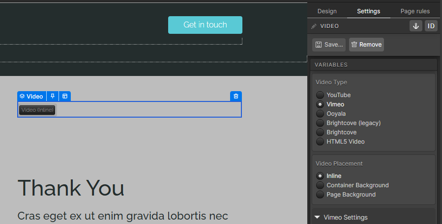 When adding any video to one of your creatives, the video will automatically be added as inline to the page. From here, you are free to add it to any container within the page with options for resizing, just as you have seen previous to this release.