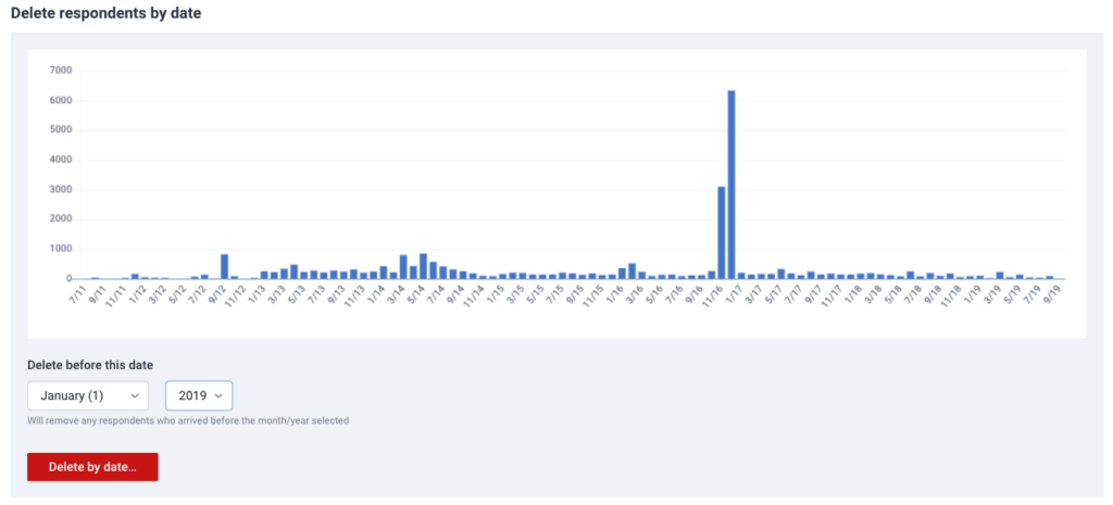 The “Delete respondents by date” option will allow you to delete respondents that are dated before a certain month/year. For example, you can specify that you want to delete all respondents dated before January 2019. That would delete data for any visitor that had come to your pages before January 2019.