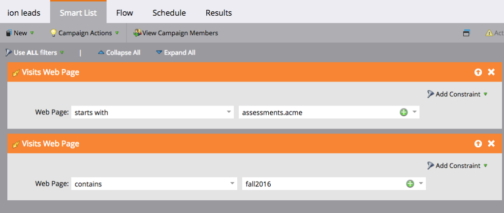 The example triggers below would include leads created in Marketo that were generated from a page on the assements.acme subdomain that has the term fall2016 in the URL: