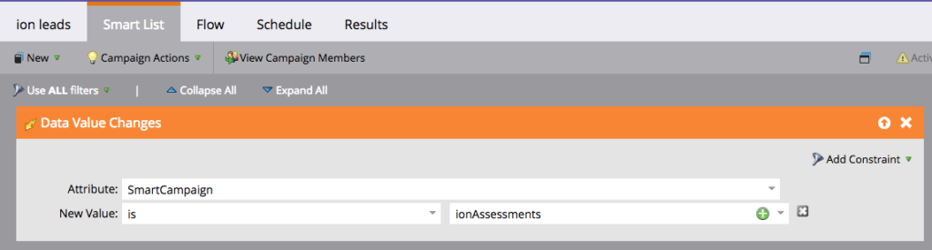 You can add Ion leads to a Marketo Smart List using the Data Value Changes trigger. For example, you can create a REST API field in Marketo labeled SmartCampaign and a corresponding ion data field.