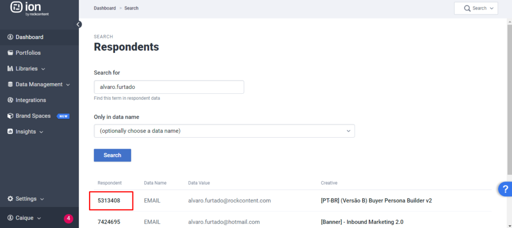 From here, you can search for a unique piece of data from your respondent to retrieve the respondent record. For example, you might search for the respondent’s email address. You can then click the respondent ID for the respondent record you would like to review:
