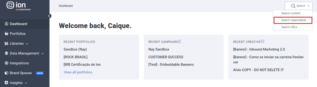 The first step to modifying or deleting respondent data field is to search for the respondent within your Ion console. This can be done by clicking the Search tab at the right top of your Ion console and selecting “Search Respondents”: