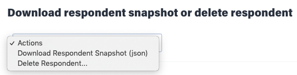 At the bottom of the respondent record, you will see a section to delete respondent data or download a respondent snapshot. In this section, there is a dropdown you can use to either download a respondent snapshot and/or delete the respondent altogether.