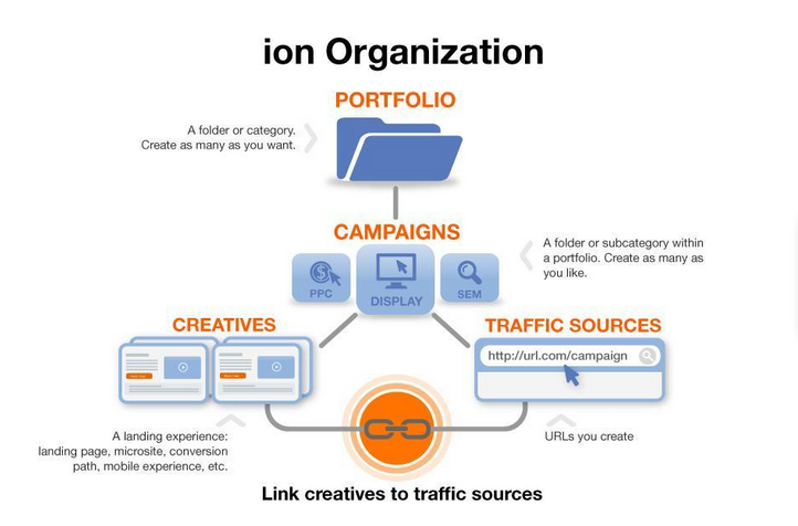 Portfolios are like folders, or suitcases, into which you will put your Campaigns. Campaigns are like folders, or suitcases, where you will actually create/publish your Creatives (landing pages, micro sites, conversion paths, mobile pages, etc) AND where you will “go live” and set up tests with Traffic Sources. Traffic Sources are unique URLs you create in Ion and you can set up your A/B tests on your Traffic Sources.