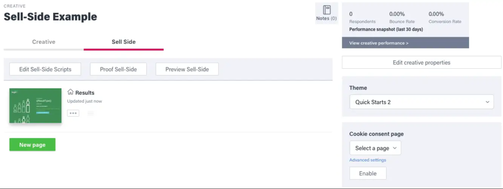Above the pages within your experience you will find two tabs: Creative and Sell-Side. Simply click the Sell-Side tab to switch over to the Sell-Side page(s) within your creative.
