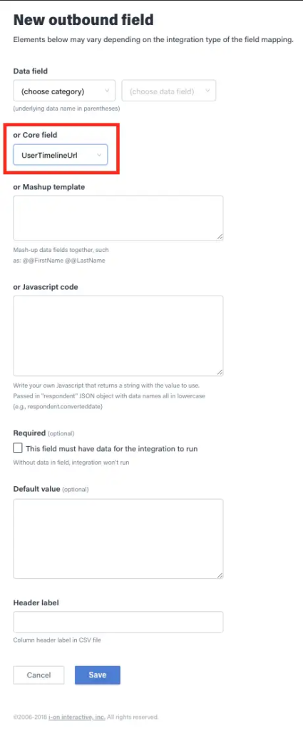 To include a link to Sell-Side pages with your integration, simply add a new field to the integration’s field mappings and select the “UserTimelineURL” core field.