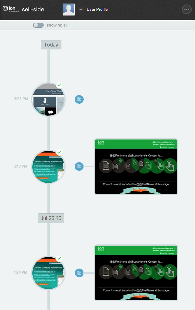 Instead of looking at data collected into a series of fields in your CRM, you can export a simple link which you and your team can click to view the the user’s interactions within the context of the actual page they viewed. You can even customize your Sell-Side pages to give your team helpful hints and messaging to use when following up with a prospect.