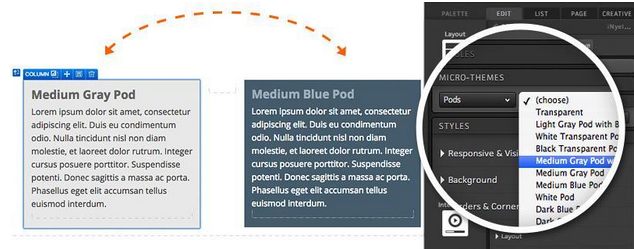 When editing a container, you can use Micro-Themes to apply variations of styling options built into your theme. This gives you the ultimate control over how your page is styled within the safe and consistent standards built into your branded theme. For instance, you can style any group of links as either your main navigation tabs or as footer links. You can also apply different color and style schemes to your content pods, forms, and other page elements, to create an alternate, on-brand look and feel to your page.