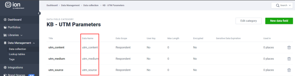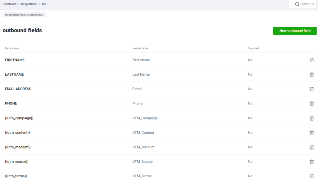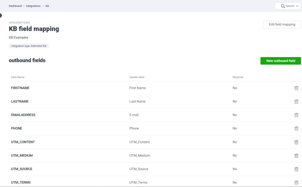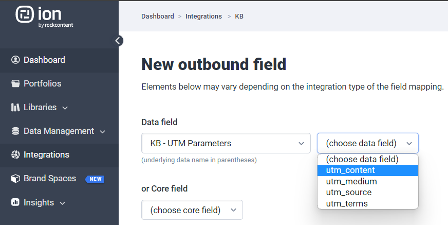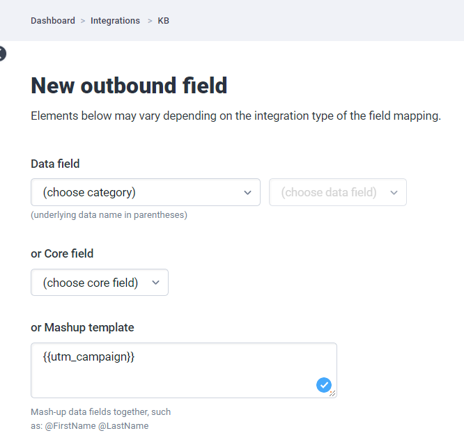 If you have more than one integration and want to make it easier to add the fields, you can create the fields within your data field category. The title can be any name you want, but the data name must be equal to your UTM parameters. Back to your integration field mapping, you can create the new outbound field and select the field you’ve just created.